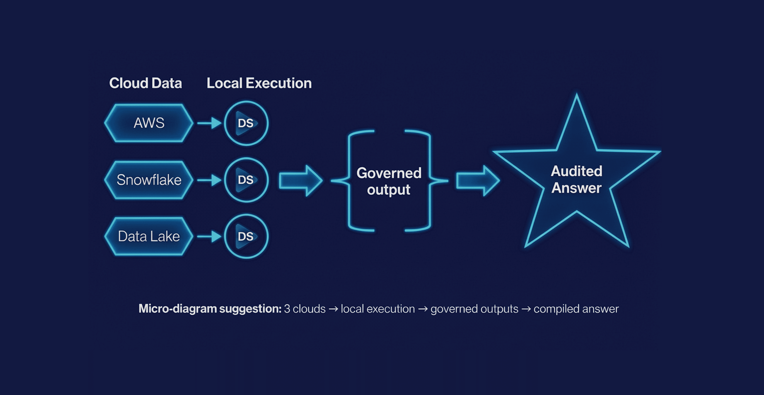 Boundary-respecting merges. Only approved results cross accounts or clouds, and lineage plus policy context travel with the answer.